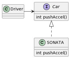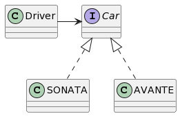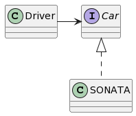 Driver 클래스는 Car 인터페이스에 의존하고, SONATA 라는 구현체 클래스를 통해 Car 인터페이스를 구현할 수 있다.